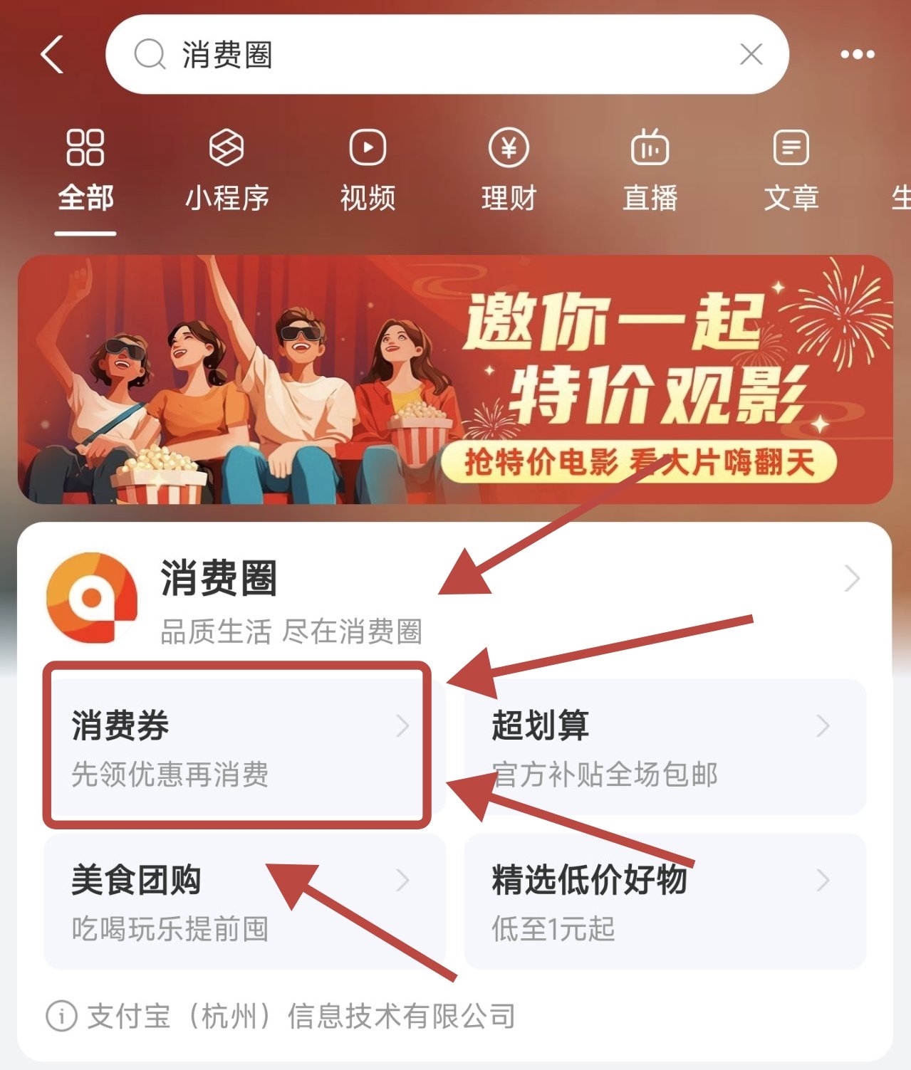 2.打開支付寶搜索消費圈(學生黨和工作黨都可以免費領,沒有門檻)