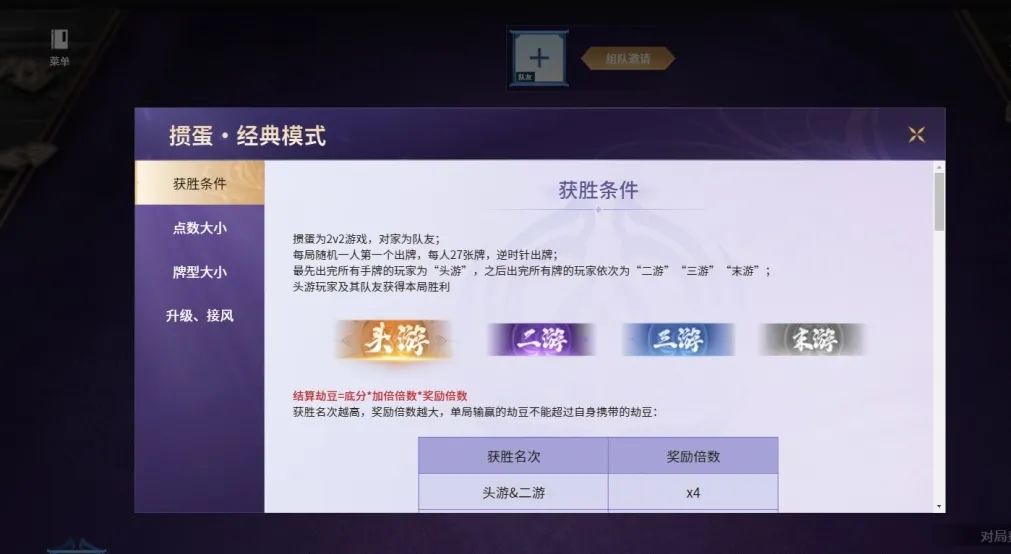 摜蛋玩法內,可選擇“經典匹配”和“四人開黑”兩種玩法,雙排四排隨你選~進入匹配界面後,點擊右上角“規則”,即可瞭解摜蛋規則。