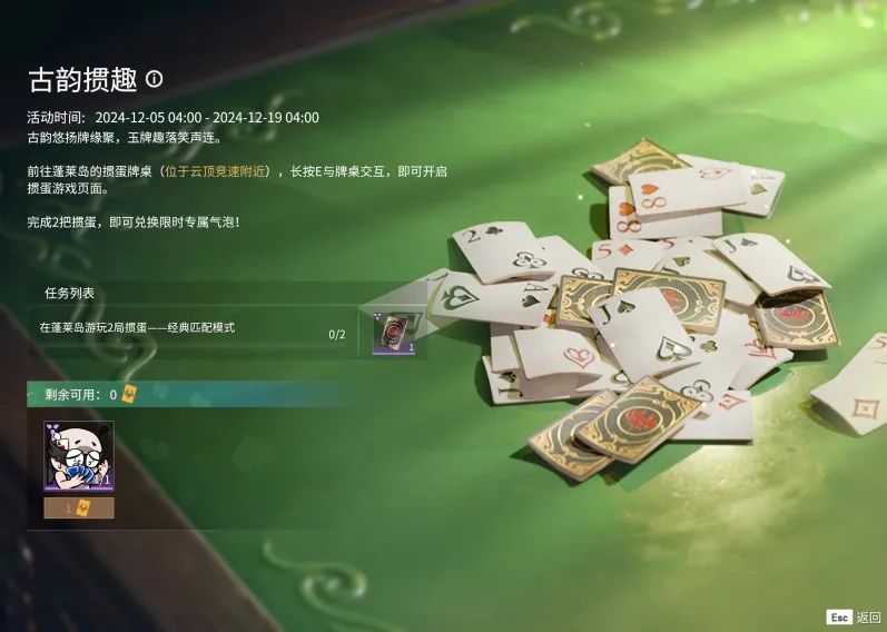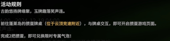參與【古韻摜趣】活動,完成兩局【永劫摜蛋】,還可領取限時專屬表情氣泡【打牌】!
