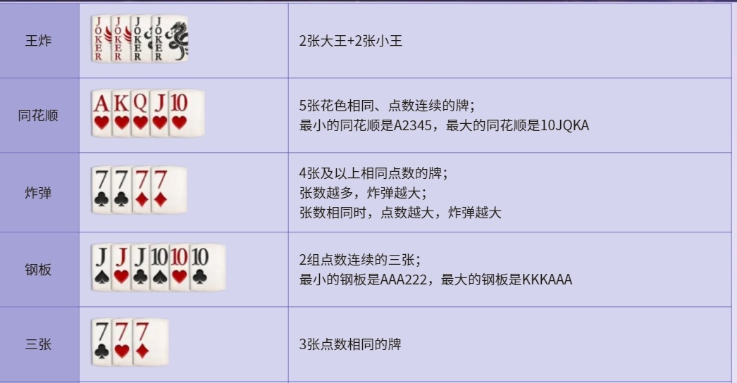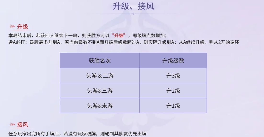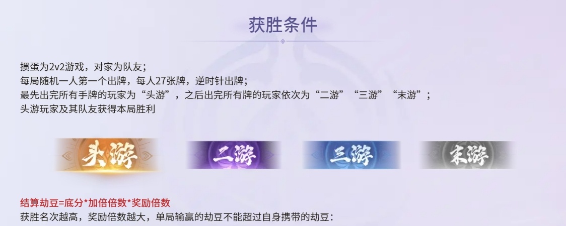 每局隨機一人第一個出牌,每人27張牌,逆時針出牌;“三遊”“末遊”最先出完所有手牌的玩家爲“頭遊”,之後出完所有牌的玩家依次爲“二遊”頭遊玩家及其隊友獲得本局勝利