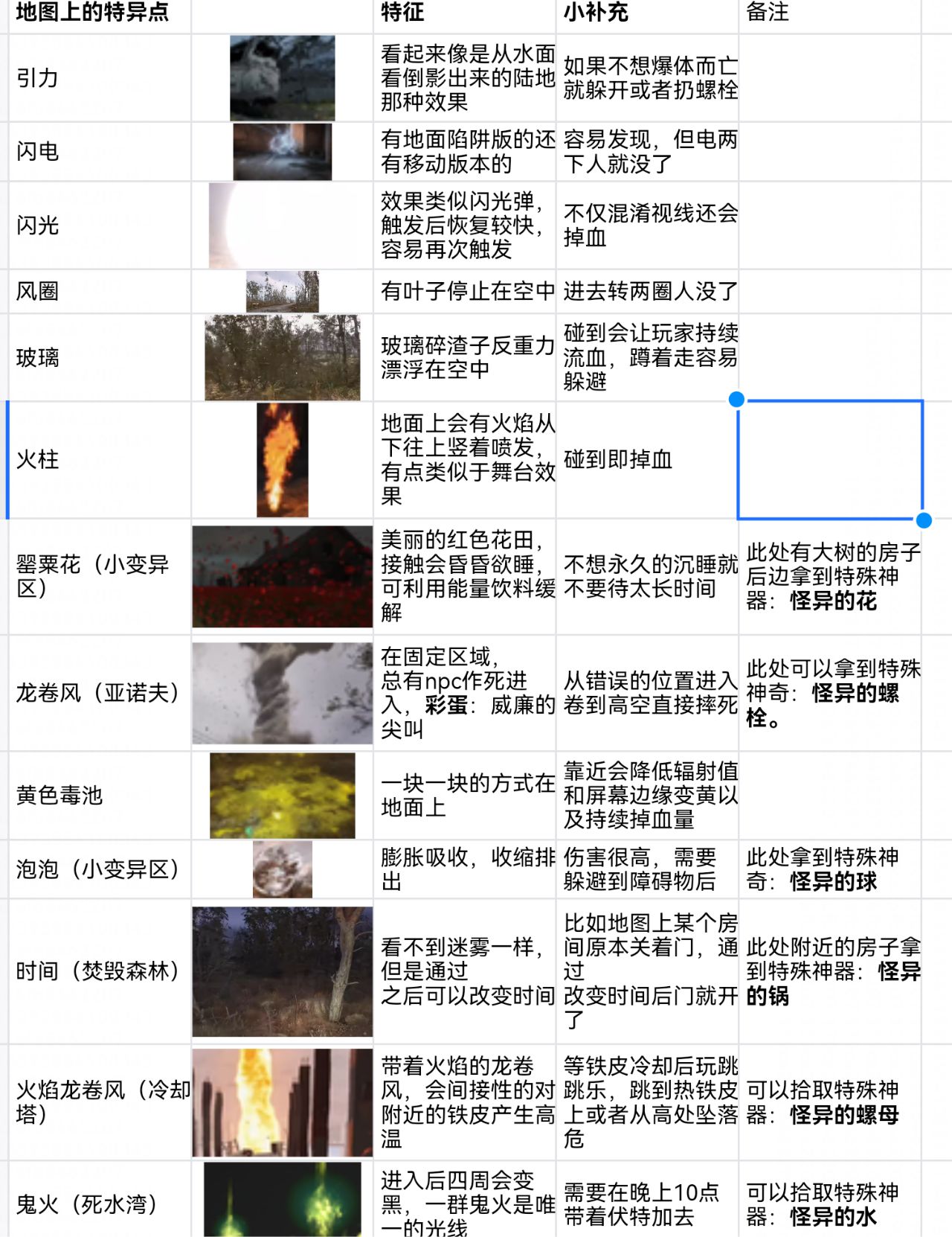 以下爲本人對於潛行者2中一些特異點所理解的表格: