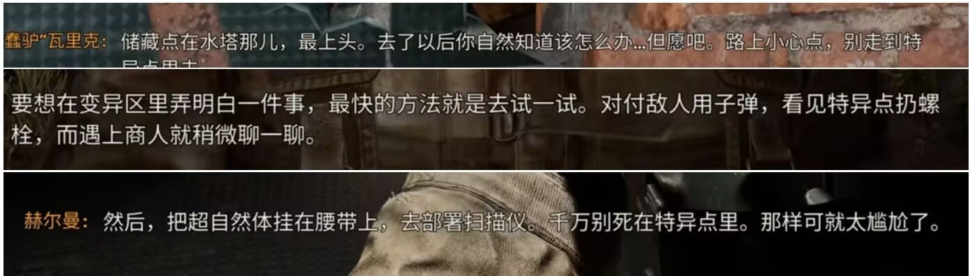 而遊戲的引導也體現在npc的口中,在遊戲中每次接受任務時,角色也會提供重要的信息,比如儲藏點的位置,在特異區該如何生存等,