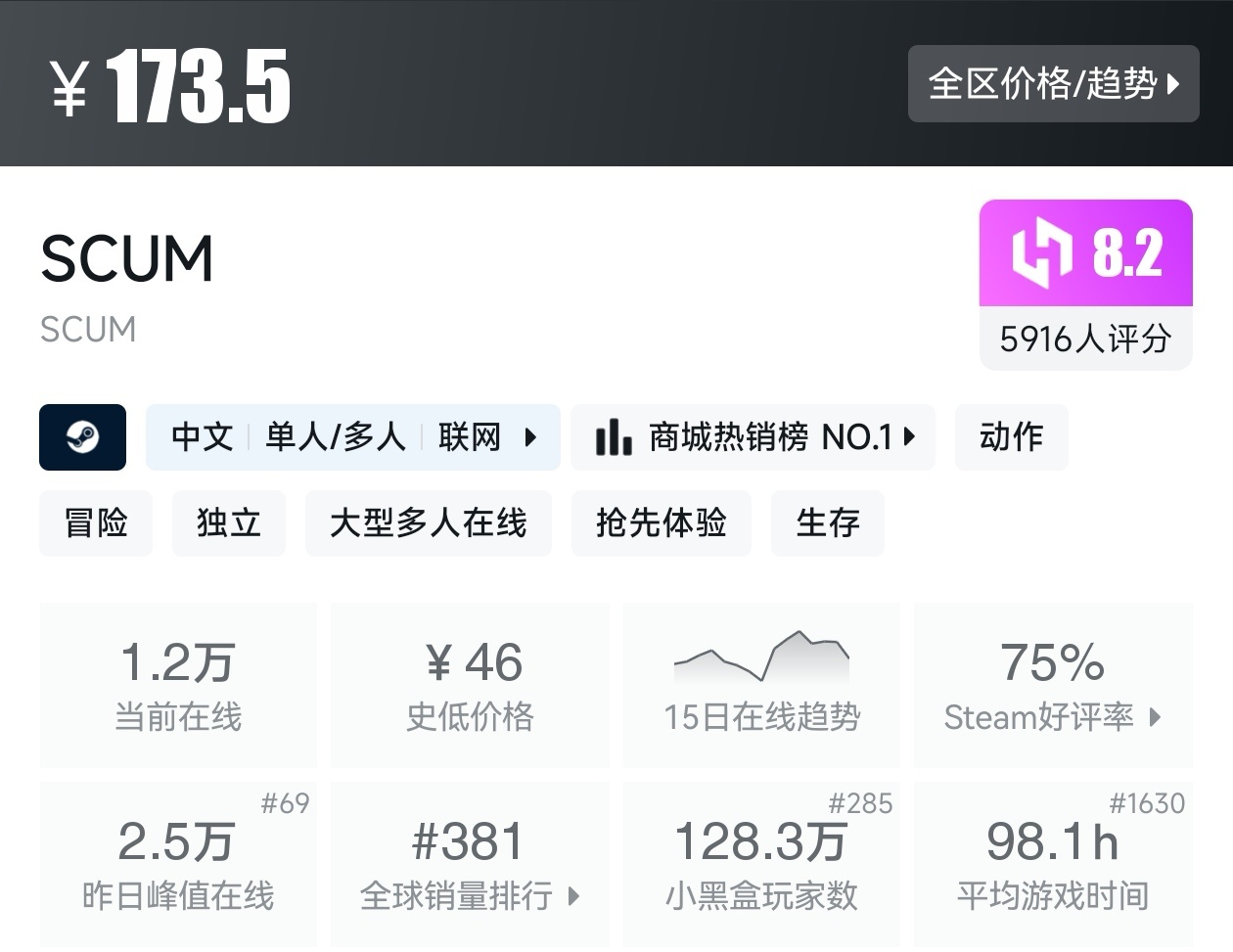 今天,黑盒商城开启了《SCUM》4折促销,而且还有对应游戏的专属优惠券,比游戏涨价后的史低还便宜几块钱。