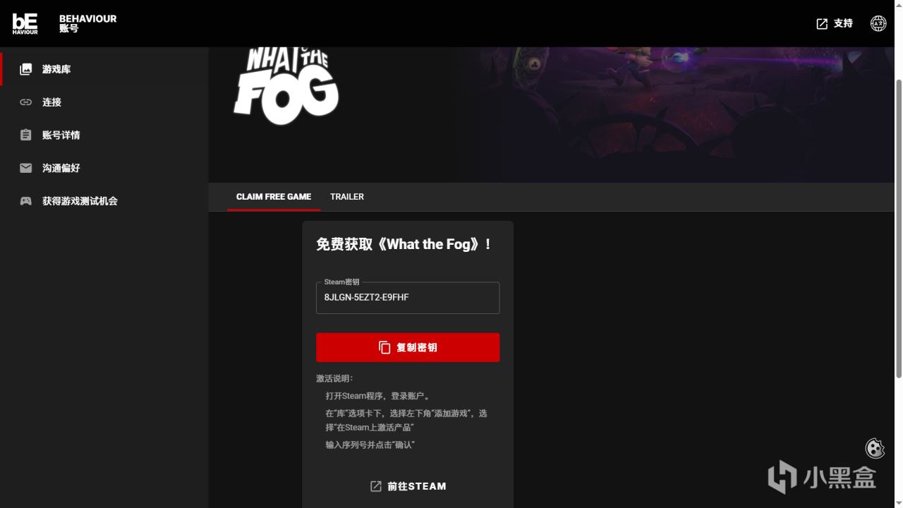 在游戏库中下滑找到《What the Fog》,绑定Steam账户领取激活码,如果没有出现就多点几次,或者等待一会刷新页面再次点击!