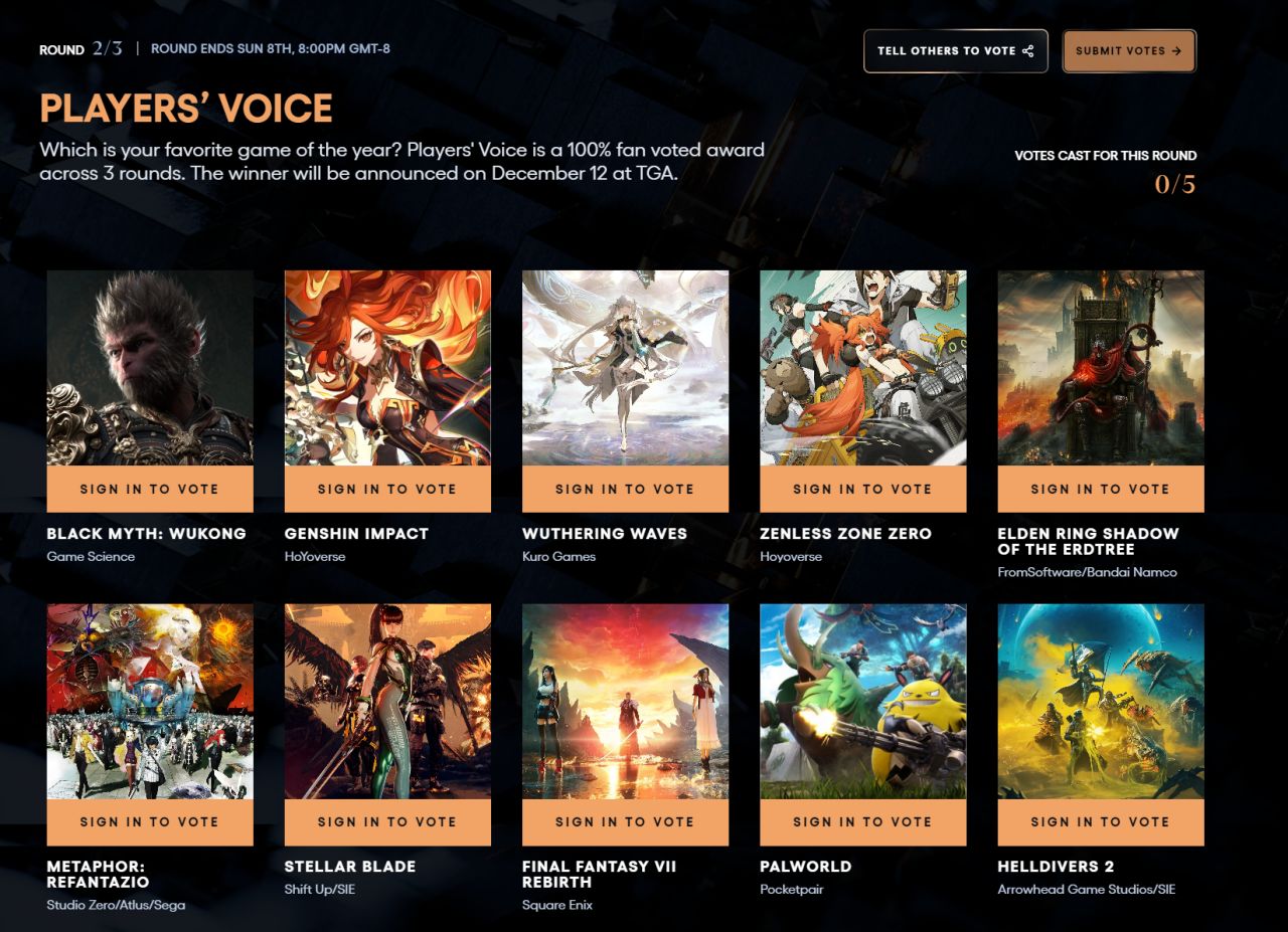 TGA官方现已正式公布“玩家之声”奖项的次轮投票结果,共有10款游戏成功入选,接下来这10款游戏中再选出5款游戏,最终获奖结果将在北京时间12月14日举行的TGA 2024颁奖典礼中正式宣布,以下是本轮成功入选的具体游戏名单: