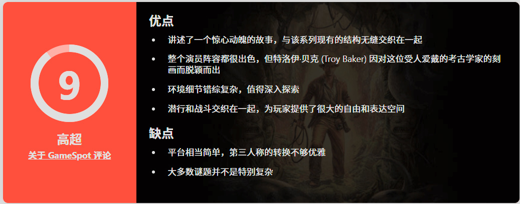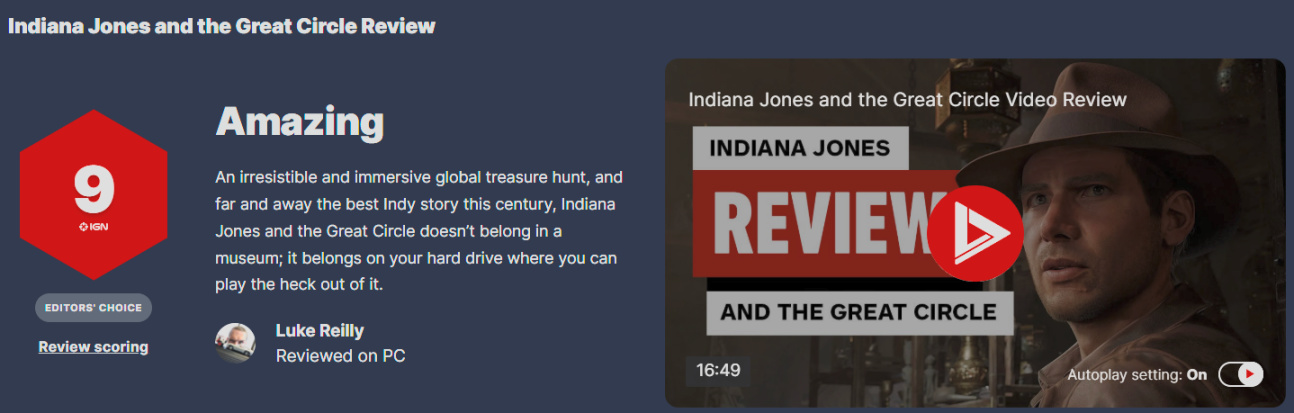《夺宝奇兵 古老之圈》聪明有趣,很有《夺宝奇兵》电影的风范,是一款潜行动作佳作,标志着 MachineGames 迎来了一个勇敢的新时代。