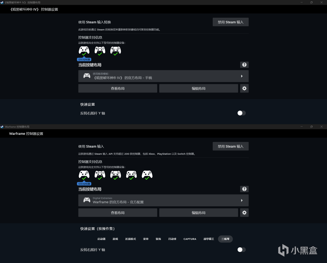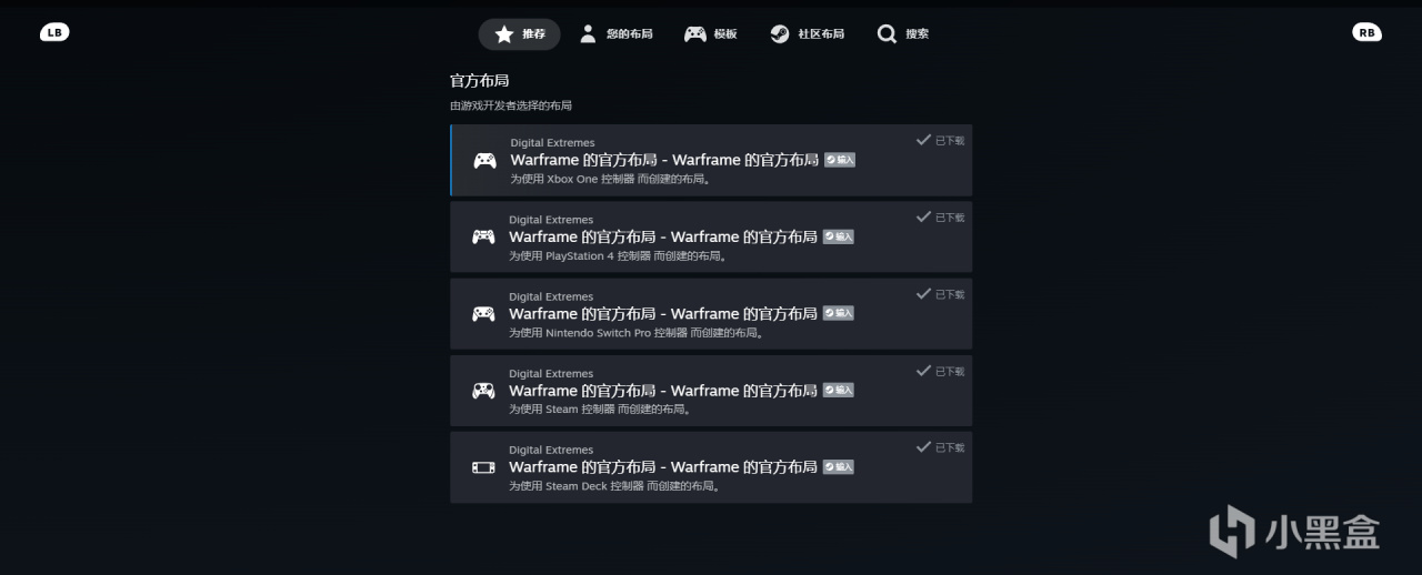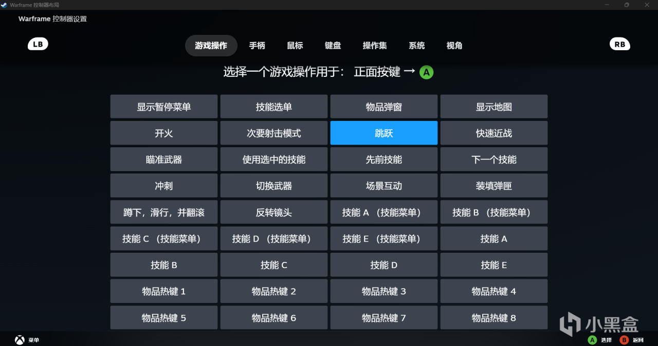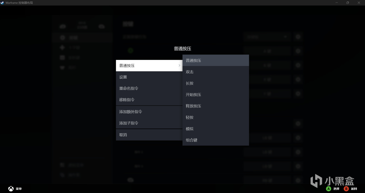 和warframe相比暗黑破壞神4支持的手柄類型更少,下方也少了很多選項,這種情況是遊戲本身決定的,有一些遊戲的開發商在steam輸入中對手柄做了獨家的設置,warframe在這一方面堪稱典範,不僅支持的手柄類型更多,可以選擇的快捷鍵更多,甚至還區分了不同的應用場景,我們就以它爲例來展開講解。