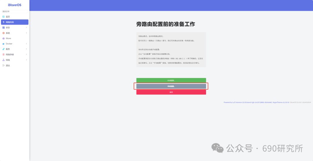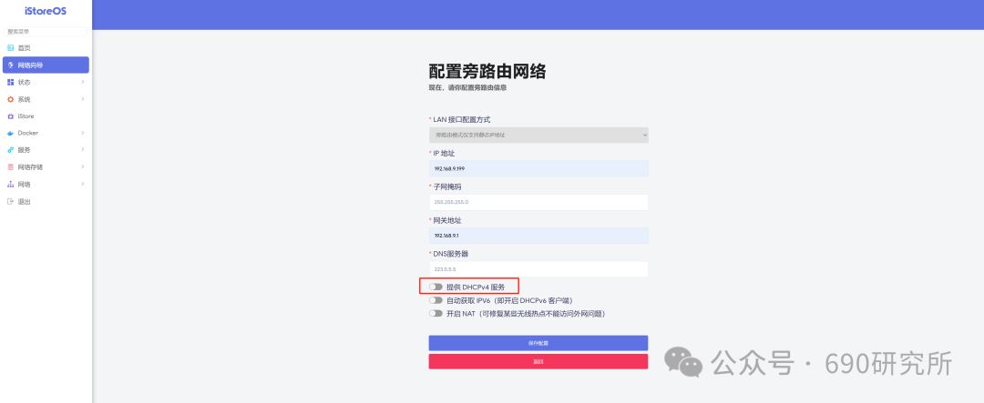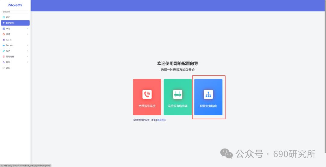 这时候istoreos中的配置已经完成了,下面需要做的就是将我们的设备接入到旁路由中。