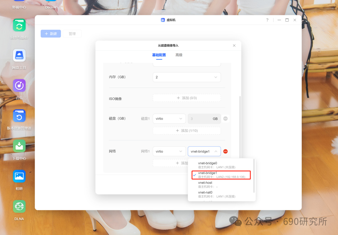 安装过程没啥好讲的,基本上就是按照默认就行。就一个地方需要注意下,绿联DXP4800是有两个网口的,如果你两个网口都接上了,这里就不需要设置。如果只接了一个网口,网络这里选择已连接的网卡,不然虚拟机是不能访问网络的,后面旁路由设置过来也不能访问互联网。