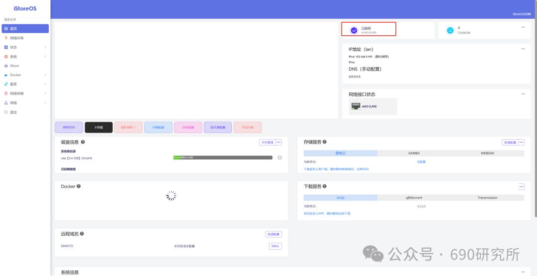 在浏览器中输入咱们设置的istoreos的ip地址,我这里是192.168.9.199。就能进入istoreos的后台管理界面,用户名是root,密码是password。输入就能进入istoreos的后台界面。