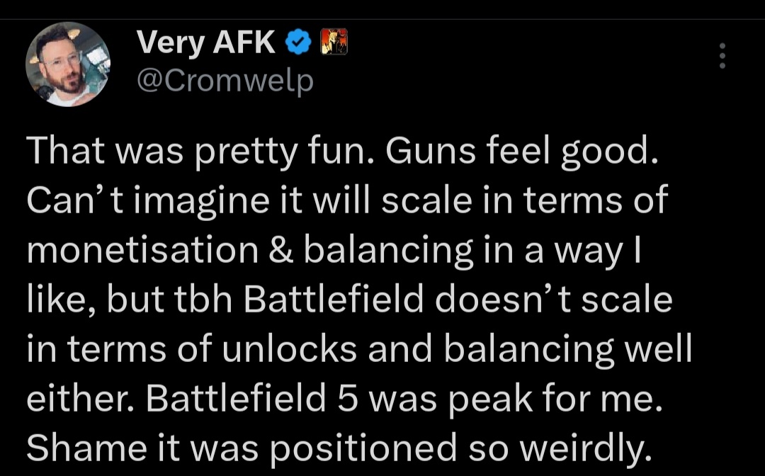 他補充說:這遊戲玩起來挺有意思,槍械手感不錯。不過,我很難想象它的商業化和平衡性能按我喜歡的方式發展,但說實話,《戰地》的解鎖和平衡性也做得不怎麼樣。《戰地5》對我來說是巔峯,可惜當時的定位實在有點奇怪。