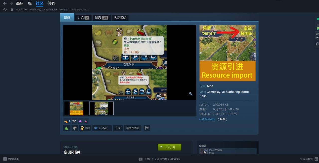 【種植mod】Steam文明6的創意工坊中的“資源引進”可以種植加成資源,包括奢侈品和戰略資源。