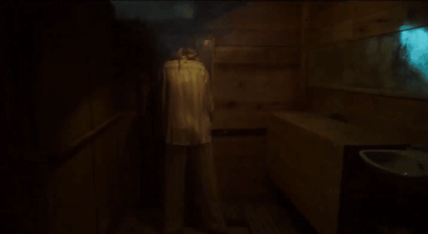 吓得大家拔腿就跑,女主一个激灵躲进厕所,看到同行的金发女在镜子前,背对着她,不说话。