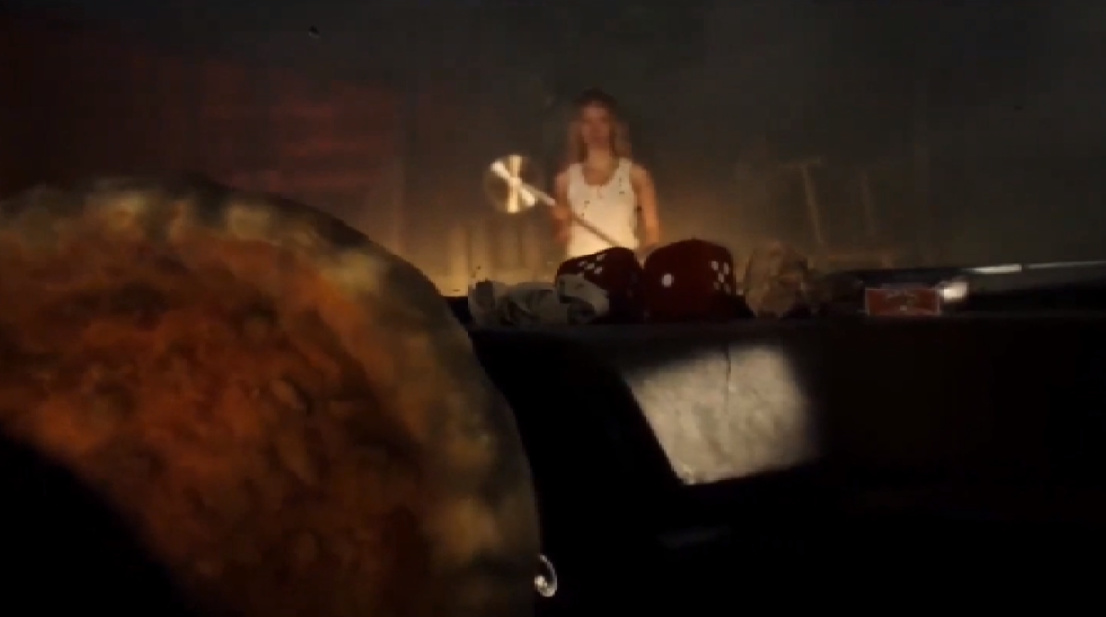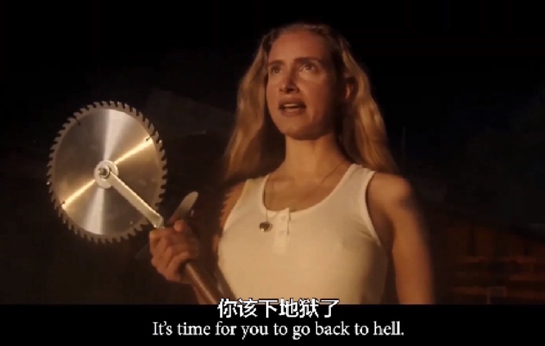 同伴都GG的女主已经没什么好顾忌的了,抄起电锯准备和准备开车来撞她的披萨决一死战,没错是开车的披萨……