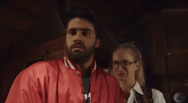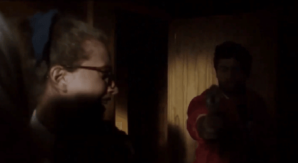 这时络腮胡队友紧急赶到,递给女主一把披萨刀,也顾及不了姐妹情谊了,直接一通乱砍,然后掉头逃走。