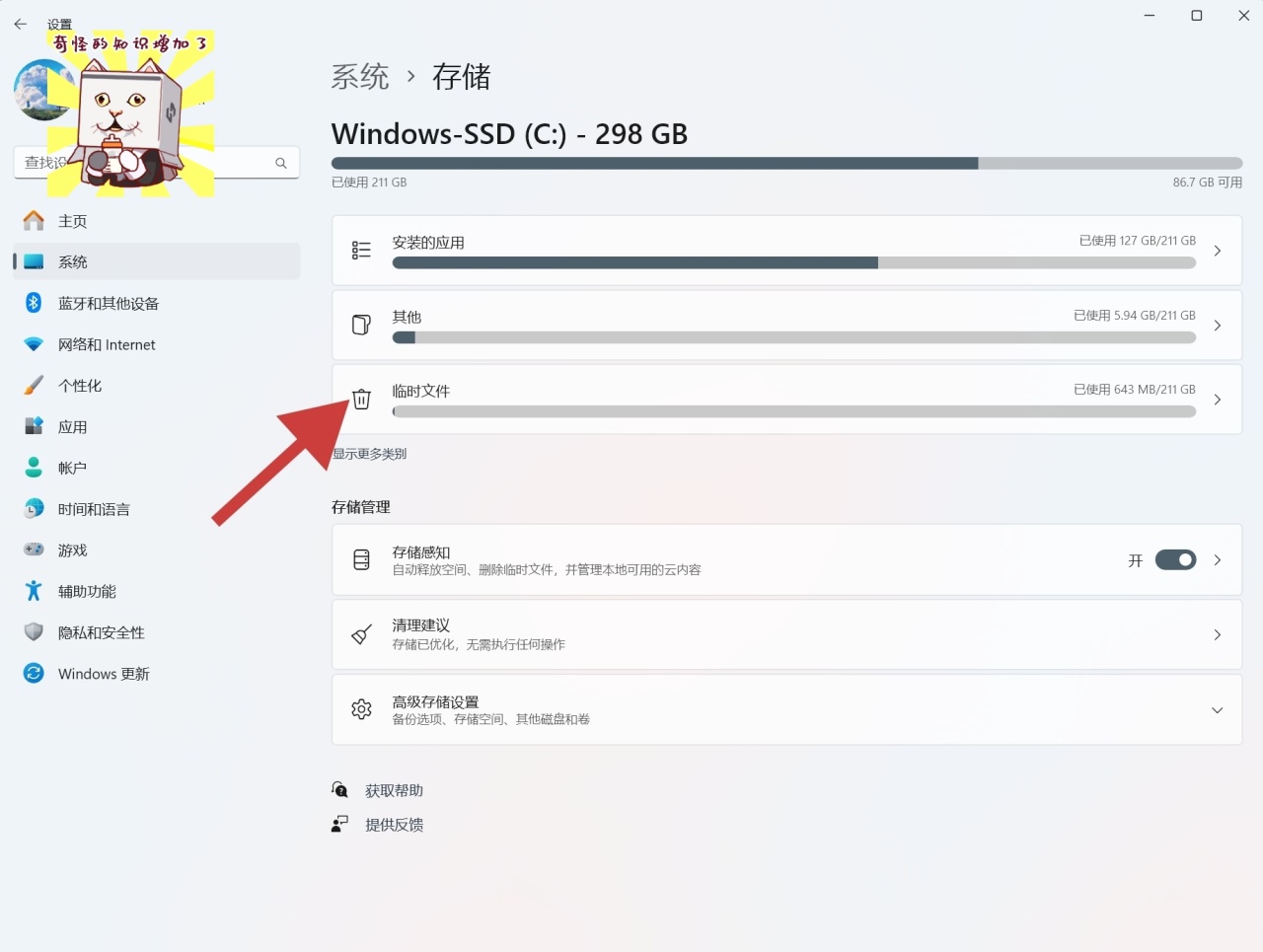 2.然后点击临时文件(我这里把那个文件给删除了,所以这里临时文件没有很大)