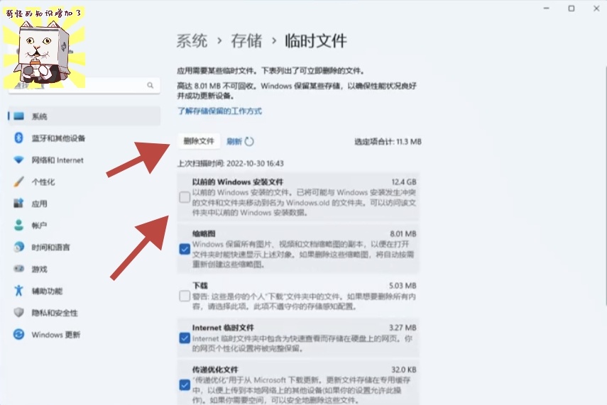 3.在临时文件里“以前的Windows安装文件”,就是Windows.old 文件,勾选上,再点击删除文件,