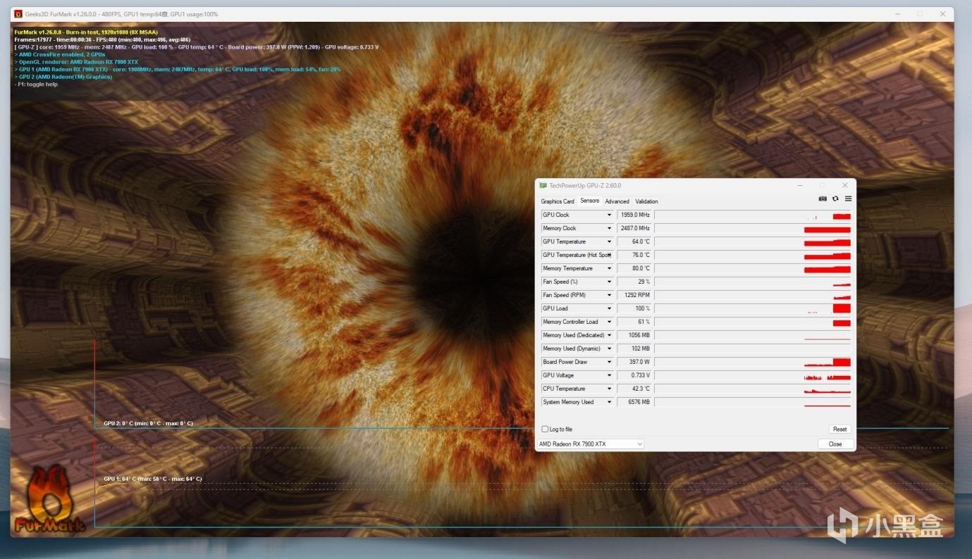 甜甜圈压力测试,功耗400W,GPU温度64度,节点温度76度,表现不错。