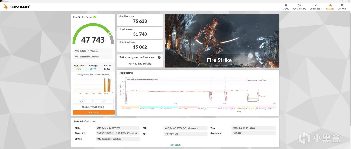 3DMARK Fire Strike测试, 总分47743,图形分数75633,物理分数31748,综合分数15862。