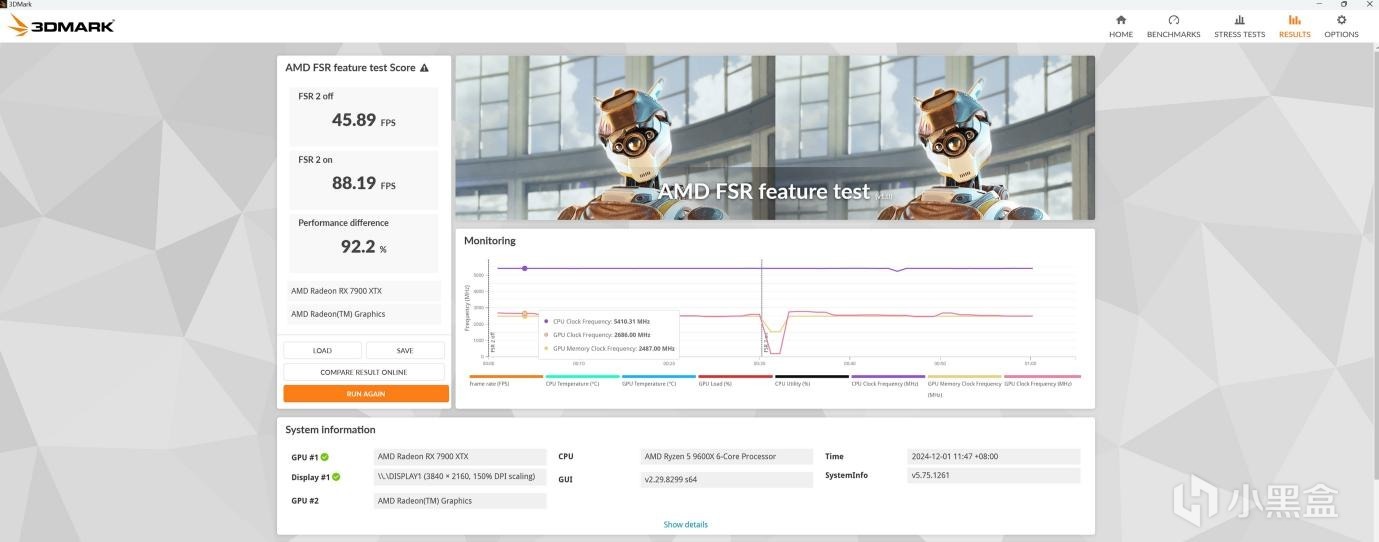 AMD FSR2测试,在4K分辨率下可以提升92.2%的帧数,达到88.19帧。