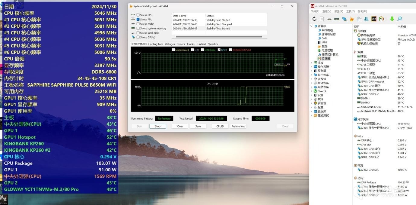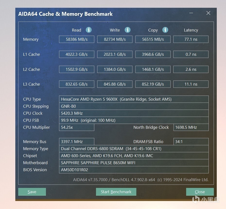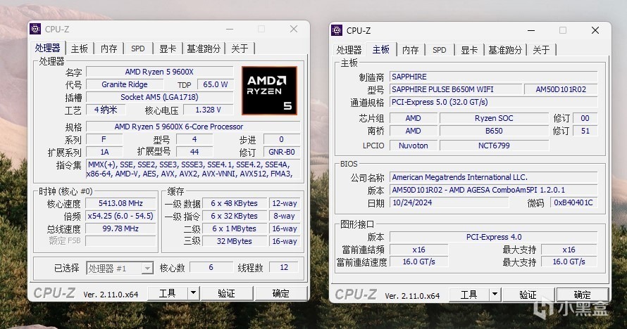 CPU-Z,可以看到CPU是R5 9600X,主板是蓝宝石PULSE 脉动 B650M WIFI。