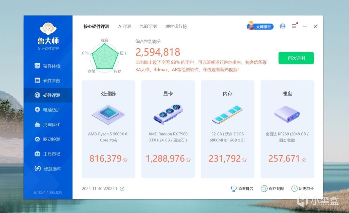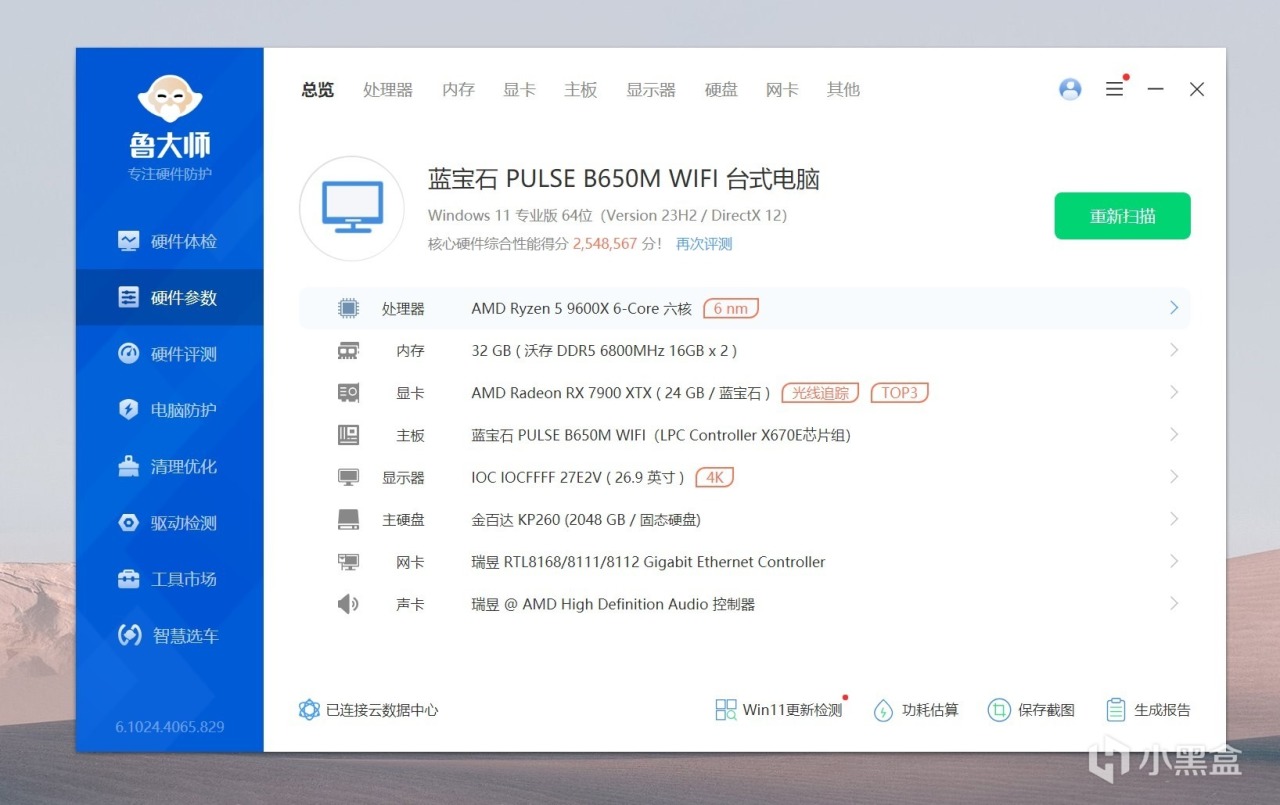 运行鲁大师,我们看看测试电脑的配置。CPU是AMD R5 9600X,内存是沃存DDR5 16GBx2,显卡是蓝宝石RX 7900XTX 24GB,主板是蓝宝石PULSE 脉动 B650M WIFI。