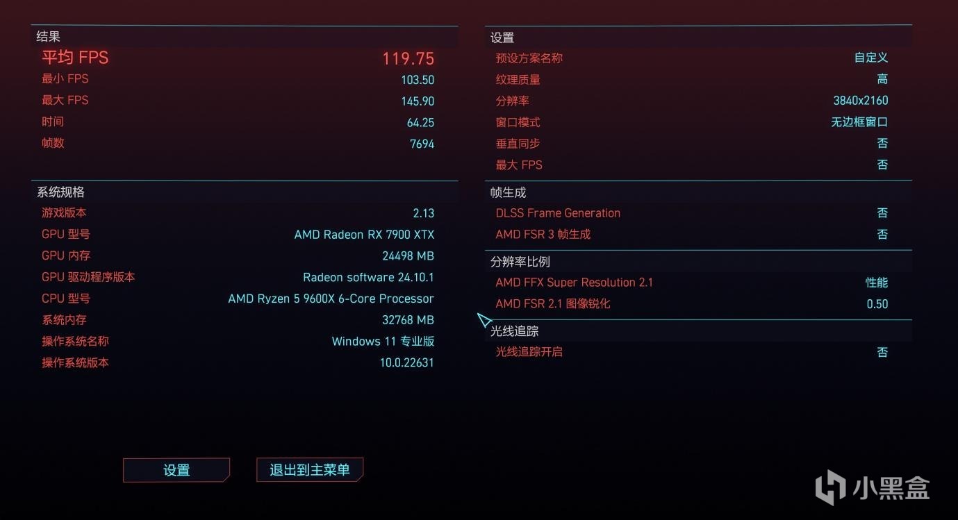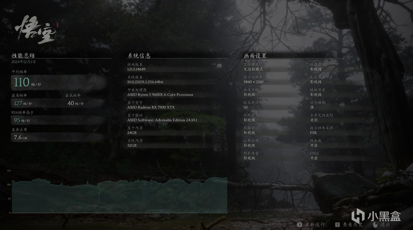 首先是年度国产3A大作黑神话.悟空性能测试工具,在推荐画质下,就是最高的影院级画质,开启FSR,超采样清晰度50,可达110帧/秒。