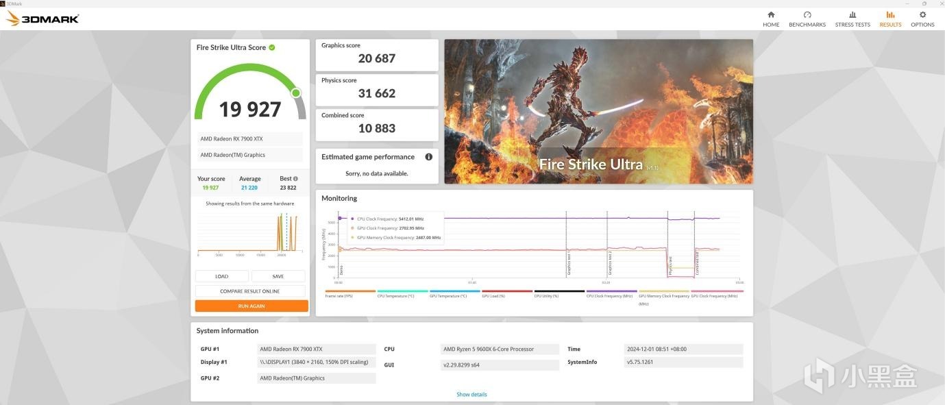 3DMARK Fire Strike Ultra测试,总分19927,图形得分20687,物理分数31662,综合分数10883。