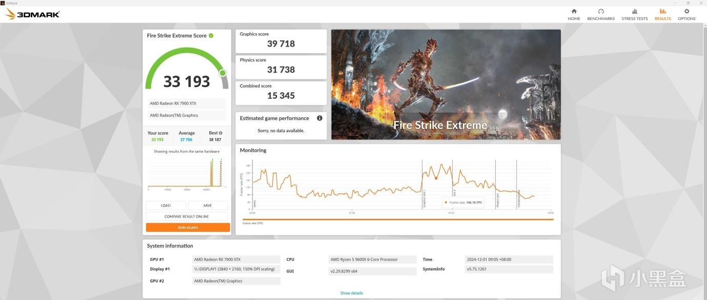3DMARK Fire Strike Extreme测试,总分33193,图形分数39718,物理分数31738,综合分数15345。