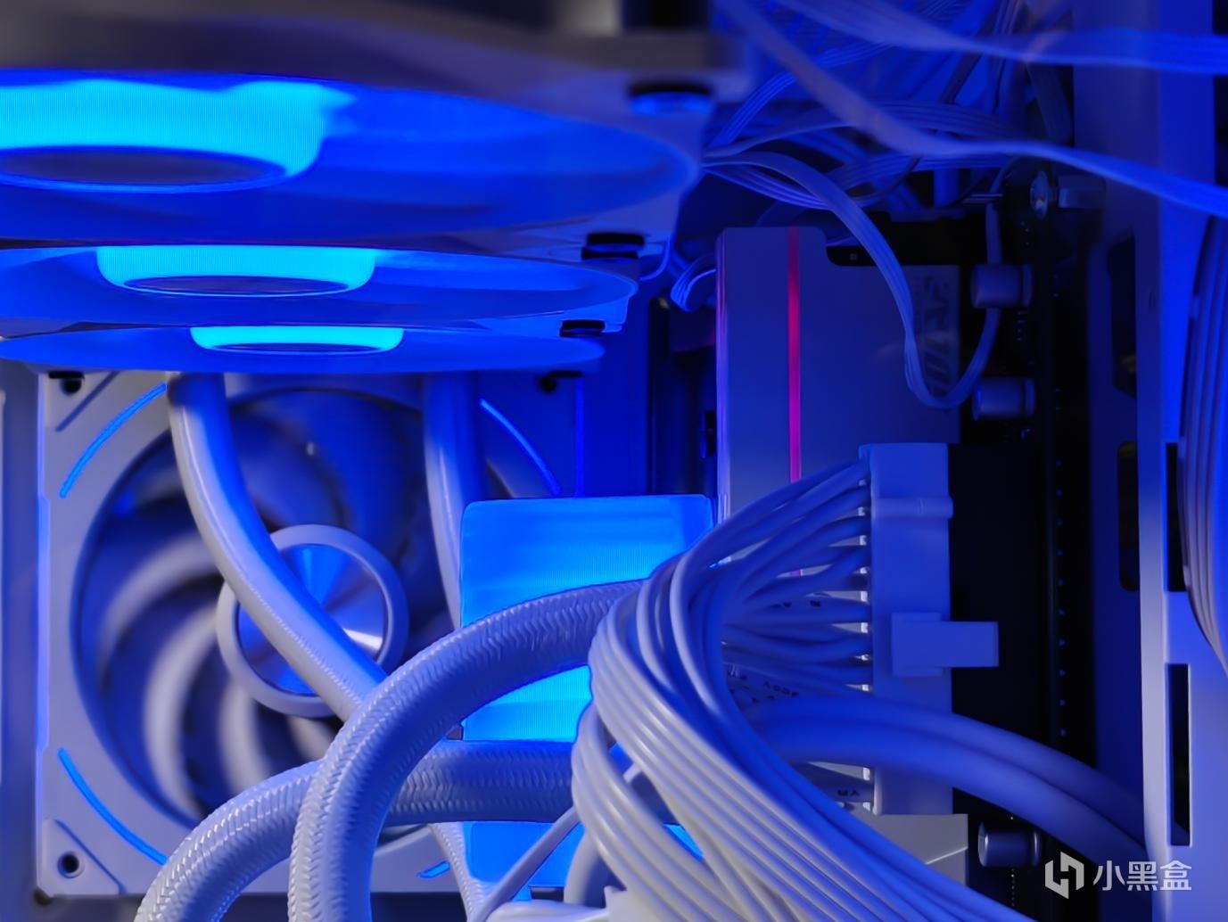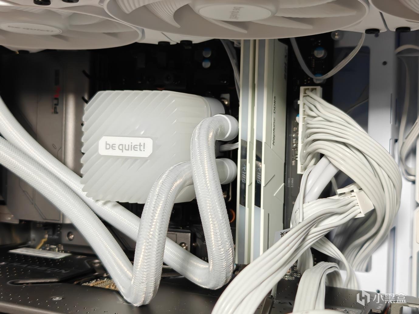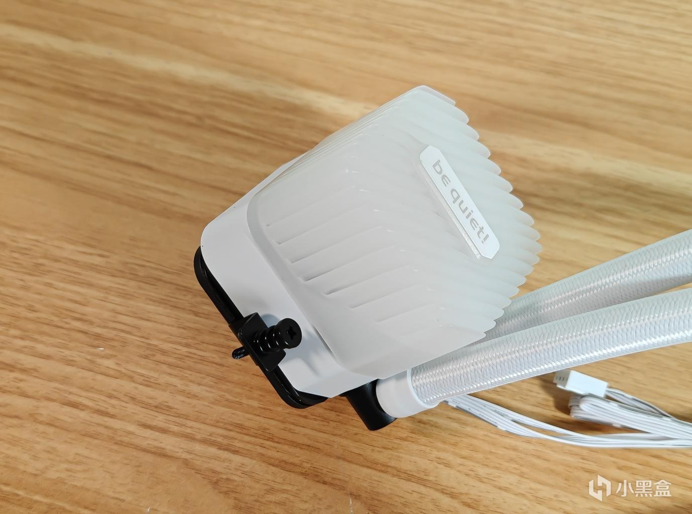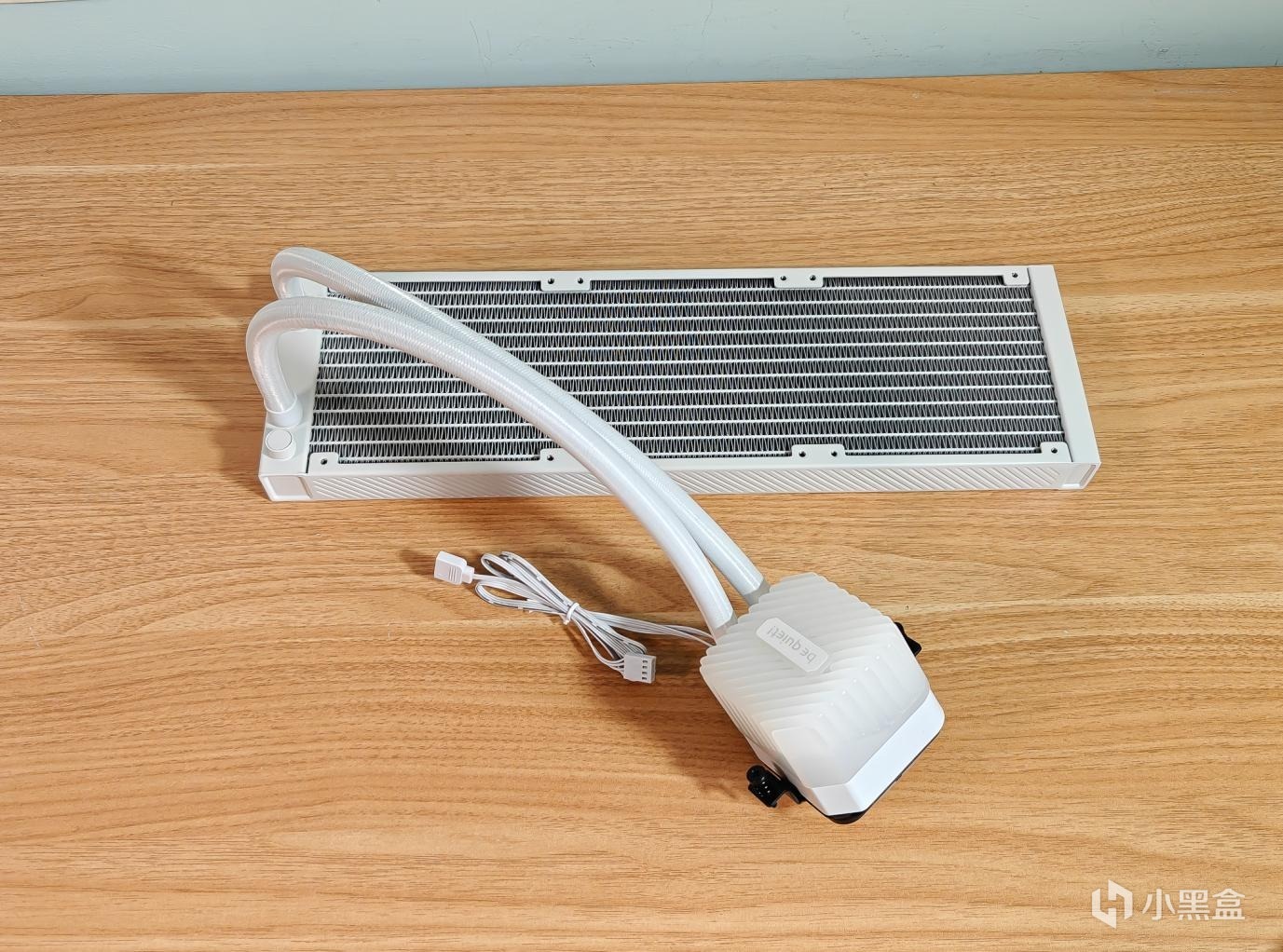 散热器使用了水冷散热器,是德商德静界的LIGHT LOOP 360水冷,白色款。德商德静界,源自德国,做电脑外设,品质超群,同时以产品运行安静而著称。这款水冷散热器是全白色的,还支持自己补充冷液。配件齐全,还有一个ARGB和风扇HUB ,支持连接6个风扇+6个ARGB接口。