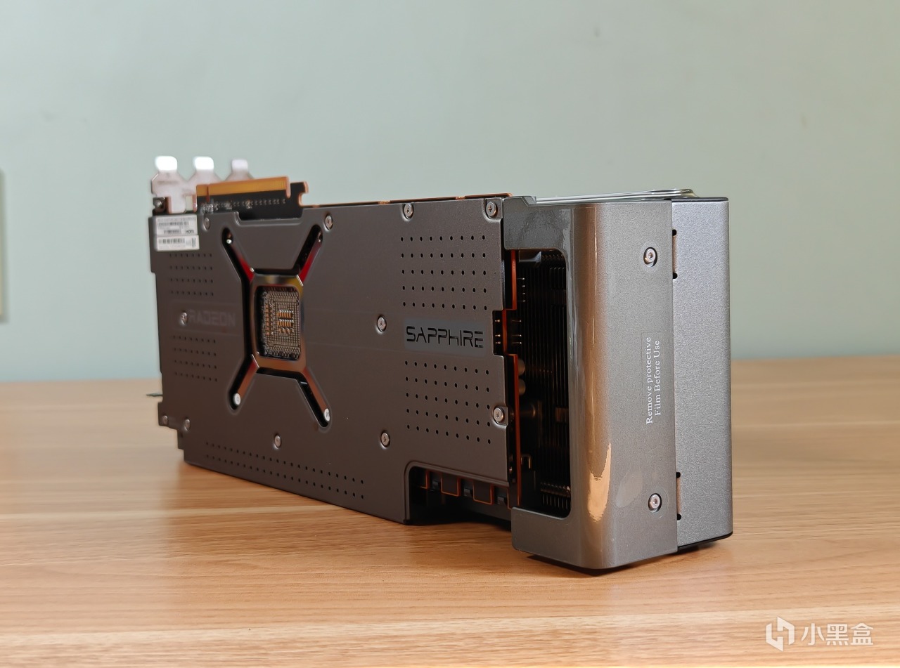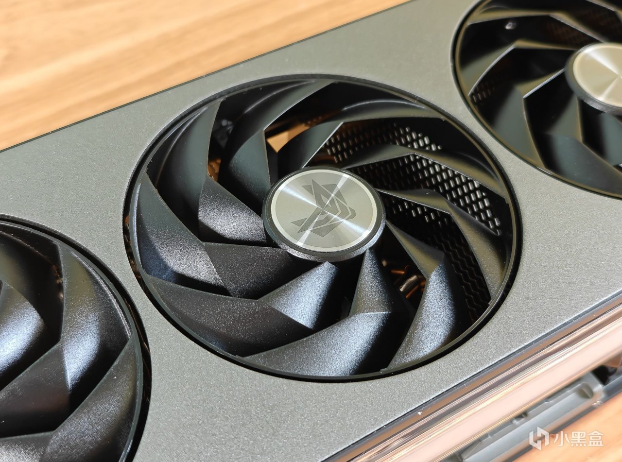 显卡非常的厚重,拿在手里满满的踏实感。显卡的长度320mm。宽度136mm,厚度72mm,占据3槽,旗舰显卡果然够力度。这款显卡的外壳是阳极氧化铝,喷砂处理泛出钛灰色的金属光泽,细腻光滑。显卡的侧面是灵动岛彩光显示,支持ARGB。可以通过TriXX软件更换色彩方案,也可以连接延伸线到主板,通过主流厂商的主板控制软件进行控制。