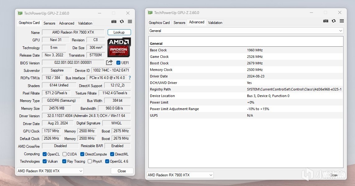 GPU-Z,可以看见显卡的参数,Navi31核心,6144个流处理单元,24GB GDDR6显存,显存带宽高达960GB/s。GPU Boost频率2975MHz,GPU Game Boost频率2679MHz,这个频率都大于前面我们提到的参数。这个是因为显卡有2个BIOS,默认就是在超频的这个BIOS上运行。