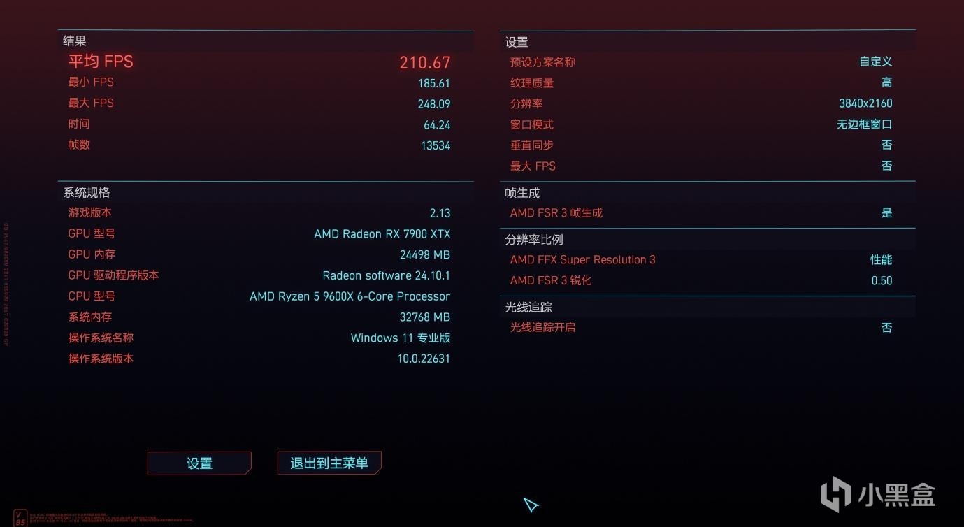 赛博朋克2077,超级画质下开启FSR3和帧生成,平均帧率210.67。