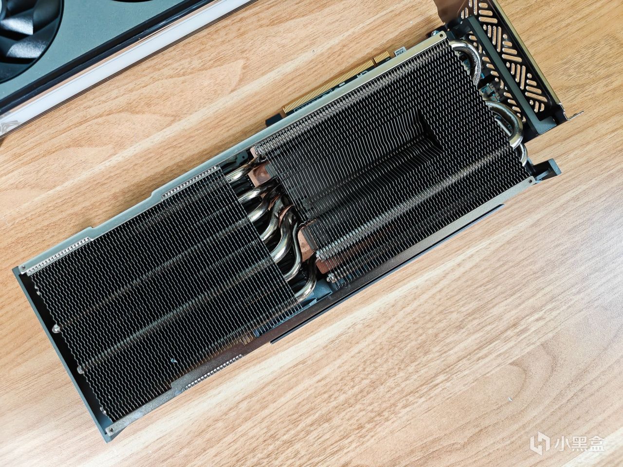 风扇模组可以轻松拆下,便于清洁。边侧有压铸铝镁合金框架,可以增加结构刚度。散热模组采用了7根复合式热管,2根是8mm,其余5根是6mm。配合安装于GPU和显存的表面的真空腔均温板,散热效果好于单纯的铜质散热器。模组鳍片采用了波浪造形设计,减少了风进入散热片模组时的摩擦,进而降低风切噪音。部分区域采用了独特的V形鳍片和 VRM 散热模组可让记忆体、mosfet和 电感快速降温,各种综合设计让这款旗舰显卡的散热效果非常优秀。