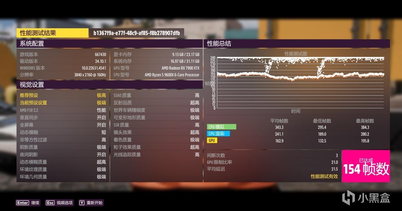 地平线5,极端画质下,在开启FSR2.2的情况下,达成154帧。其中显卡平均帧率162.9帧。