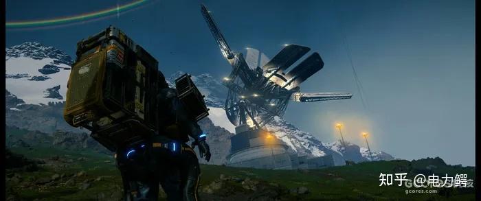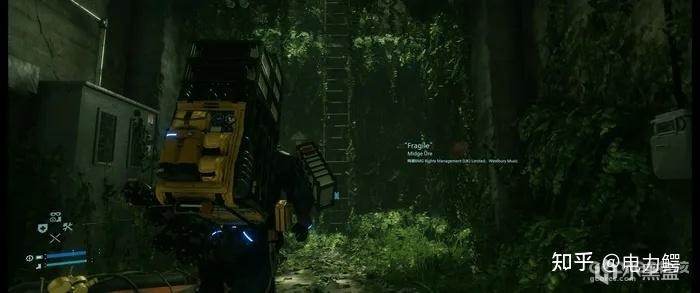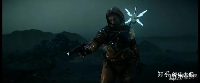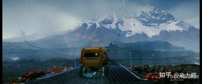 游戏中存在的很多次让人难以言表的震撼时刻,《死亡搁浅》喜欢在任何重要任务之中需要长途跋涉的时刻时,慢慢拉远你的镜头,展现出壮丽画幅下的(强烈推荐21:9体验本作)冰岛山河风光,然后随着淡入的歌曲名称和作曲者,缓缓调动情绪,优美的歌声和旋律回荡在黑绿的荒原之上、孤独、美丽、肃穆、死寂,可以说《死亡搁浅》是那种极其重视氛围塑造的作品,甚至不惜为凸显这种桥段的特殊牺牲平日赶路里也许可以播放音乐的功能。