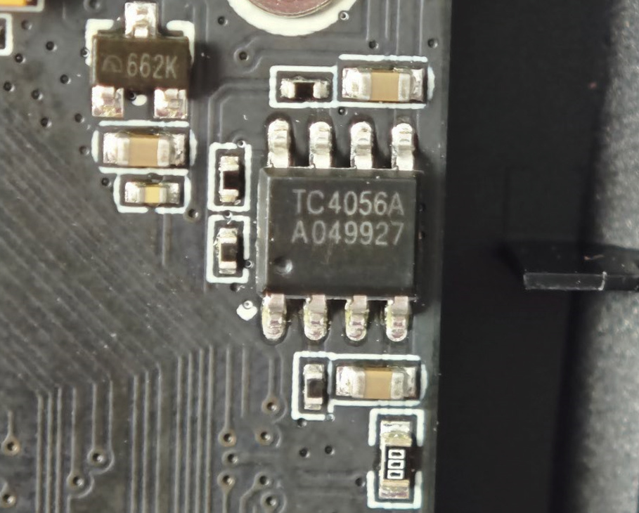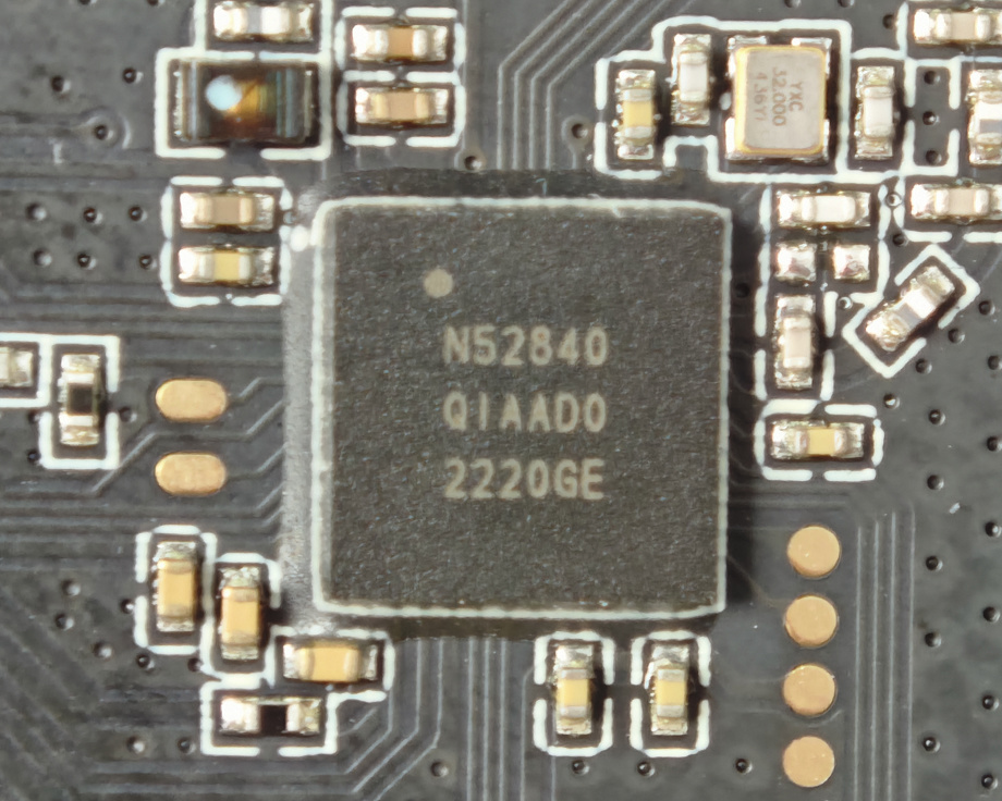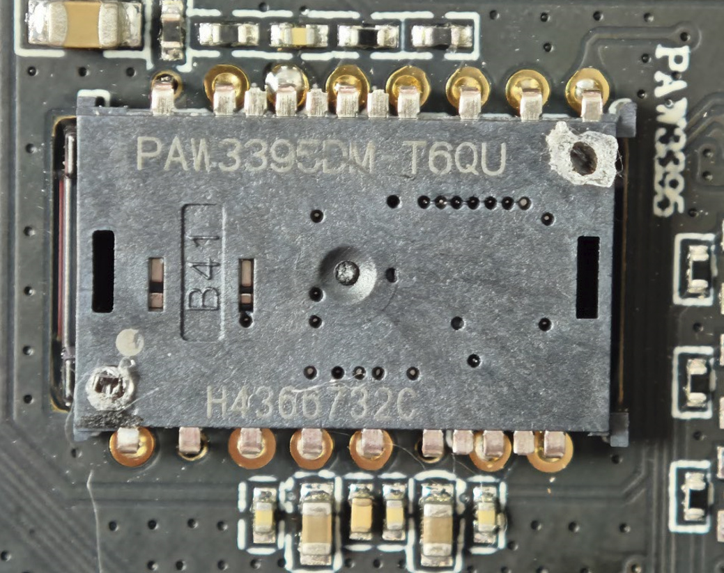 通過微距放大,鼠標傳感器爲3395,無線ic來自Nrf52840,此外在邊角還有一顆TC4056A充電管理IC。