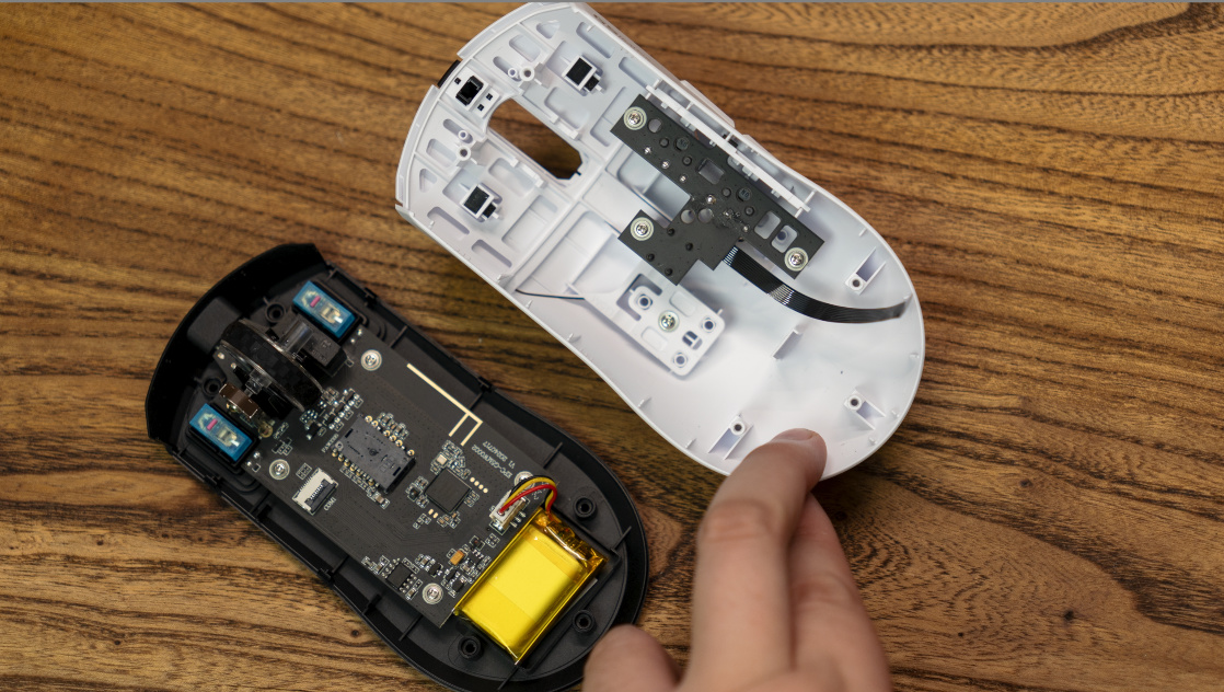 打開鼠標可以發現內部依然是傳統的天地蓋結構。底部PCB板相比同價位主打輕量化的鼠標來說規整了不少。電池容量500mAh,固定在鼠標底部。