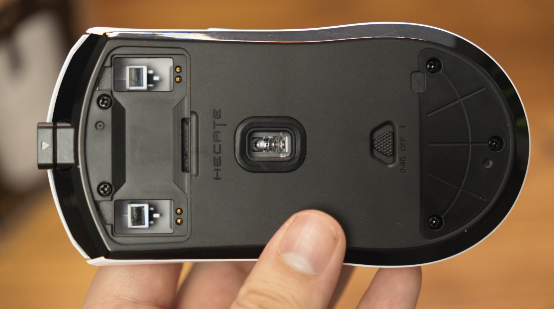 就跟你給遙控器換電池一樣。扣開,裝上,然後再扣回去。不需要擰螺絲,不需要拆開鼠標,不需要把給鼠標底部挖個洞。這就是目前最方便的熱插拔微動設計,我給滿分。