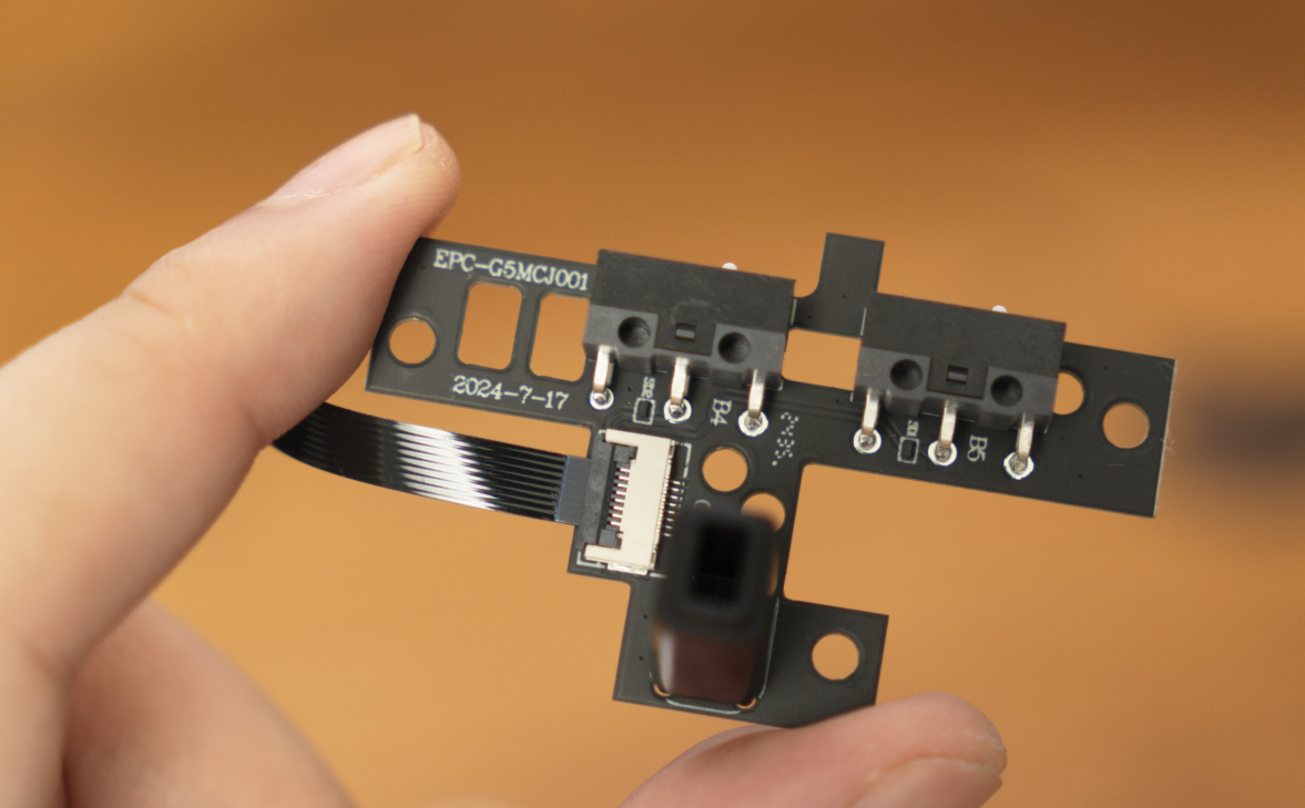 側鍵PCB有做明顯打孔減重處理,同時DPI指示燈被隱藏在導光柱下方。側鍵微動來自華諾白點。