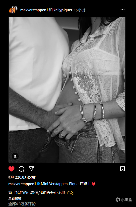 维斯塔潘在社媒中写道:“小维斯塔潘-皮奎特在路上了,我们非常高兴迎接这个小生命的到来。”