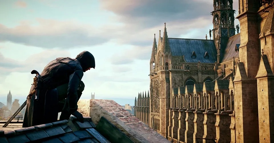《刺客信条:大革命》采用全新的引擎技术,呈现出细致入微的纹理效果、优秀的动态光影以及庞大的地图,画面放在现在也是顶流!