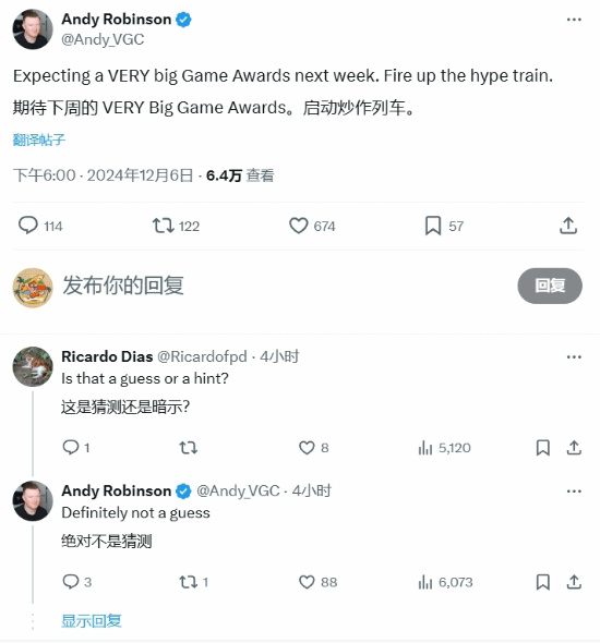 VideoGameChronicle创始人Andy Robinson在社交平台上表示今年的TGA将会是一次“非常重磅”的盛会,并强调这不是猜测,而是根据他在业内的资源所得到的确认。