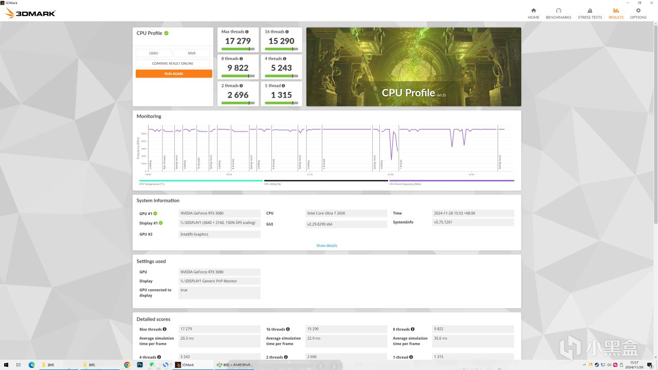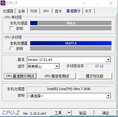 在CPU-Z里,多核跑分15377分,单核跑分约900分。和Ultra9相比,单核得分仅略差一点,多核得分和价格一样,差30%左右。