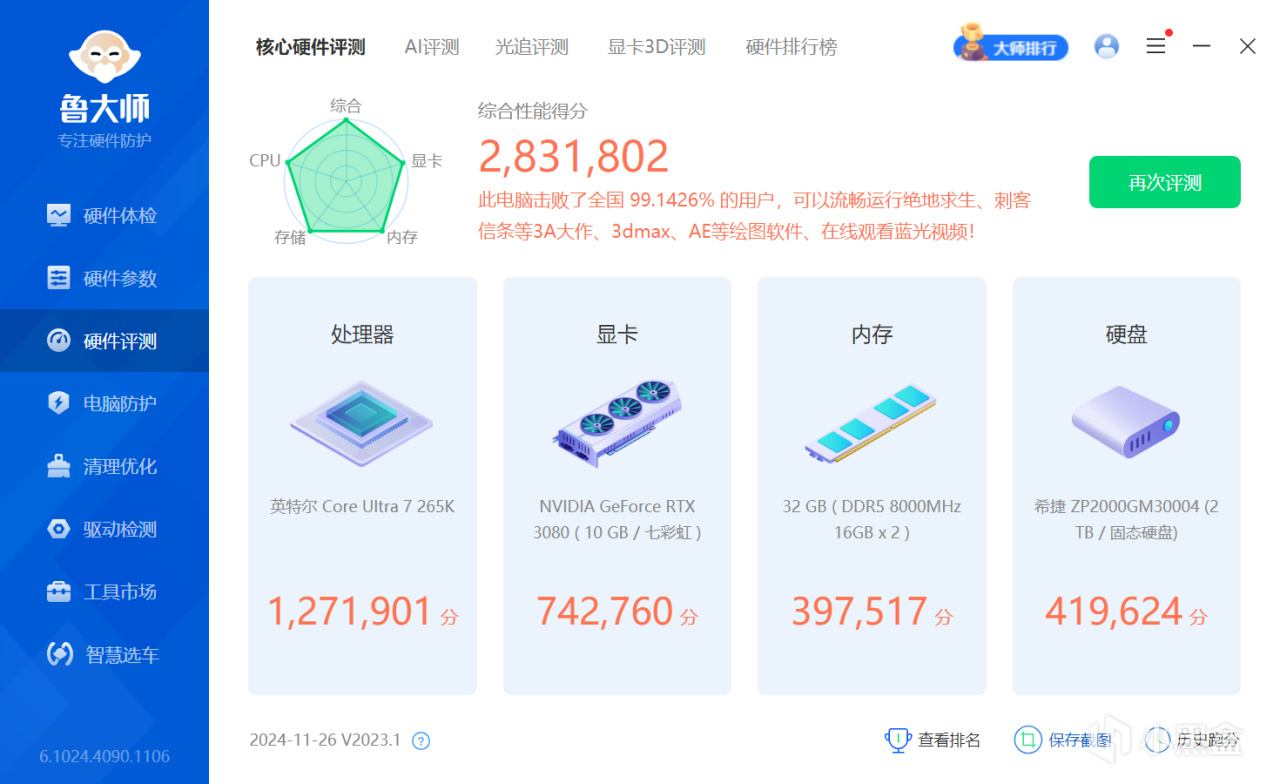 开启XMP功能后,内存会释放全部实力。内存得分从258K直接跳到397K,提高了50%。而CPU的得分在AI智能超频的加成下,也提高了差不多5%。
