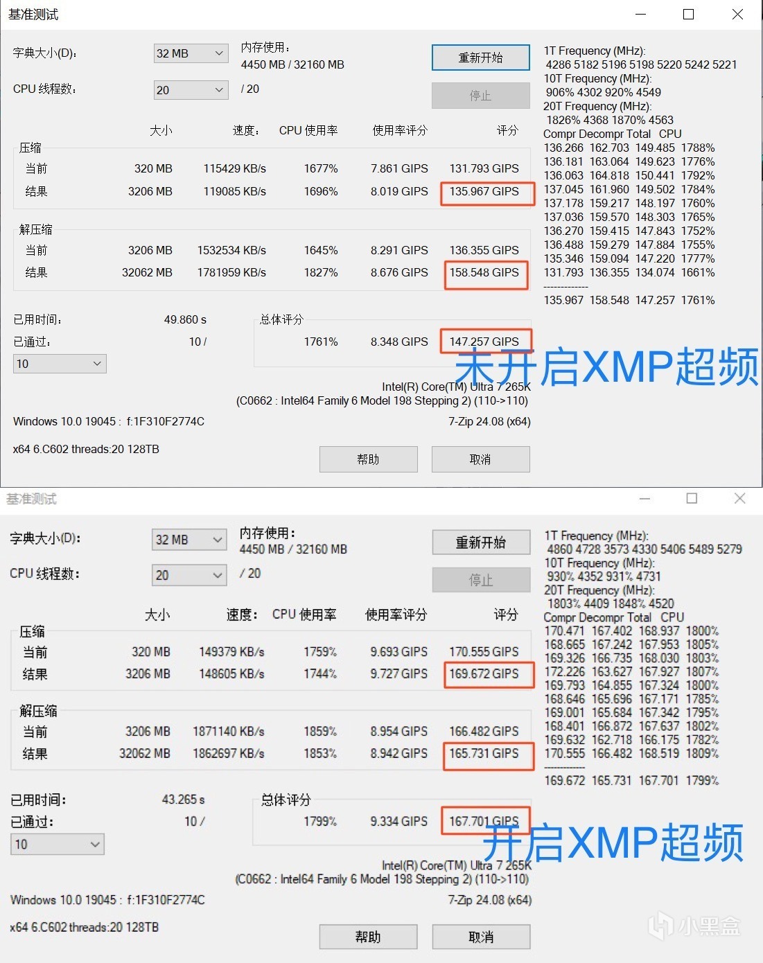 而开启XMP把频率恢复到8000MHz以后,7zip的压缩、解压缩得分提高到了170GIPS和165GIPS,总得分则是167GIPS。