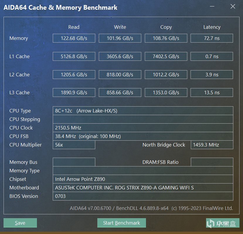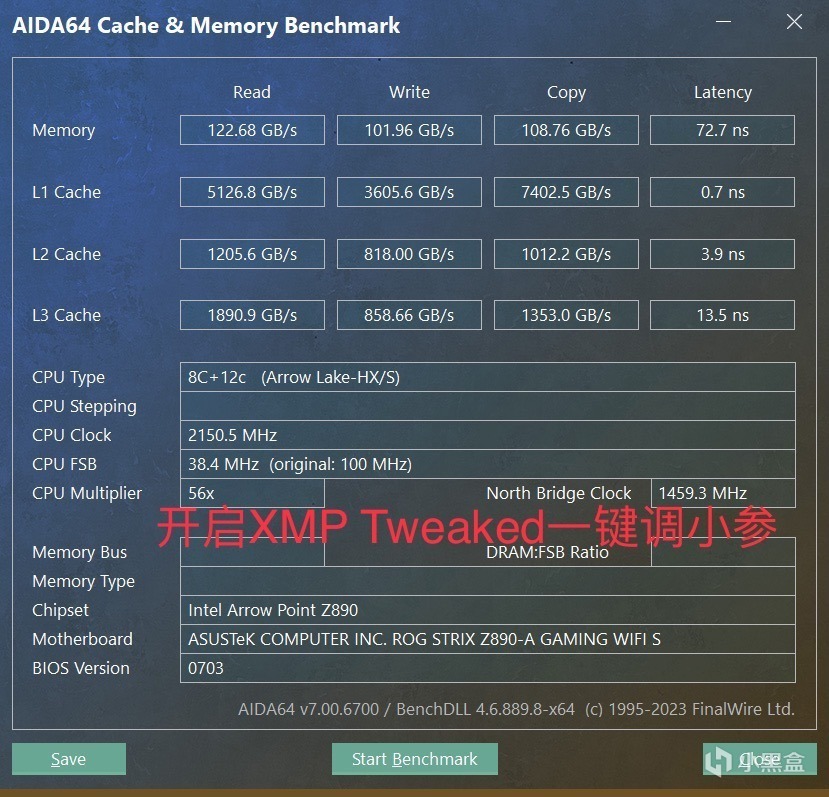 开启了主板的XMP和tweaked一键调小参功能,这条JEDEC 8000MHz频率的内存跑分非常强,读速达到了122GB/s,写入也超过了100GB/s。