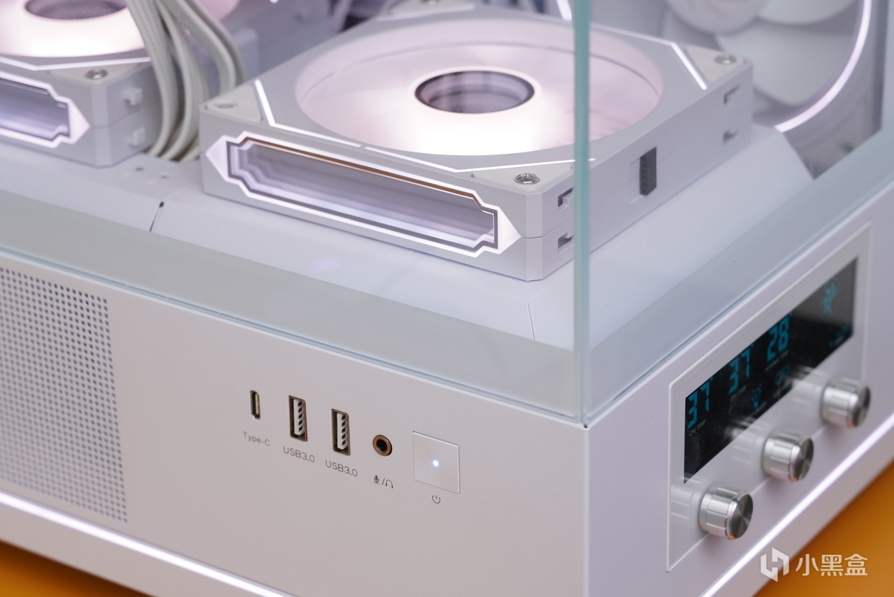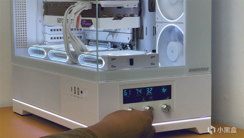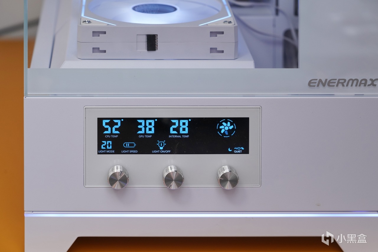 机箱正前方的控制器也很有趣,液晶屏幕上有CPU和显卡的温度,第三个数字则是附带的一个温度探头,可以把它贴在机箱、电源或其他你想放的位置,实时读取这里的温度。右侧的旋钮则是切换风扇的转速,有4档可选。在玩大型游戏时,可以调高转速以获得机箱内的风力迅速流转,带走机箱内的热量。
