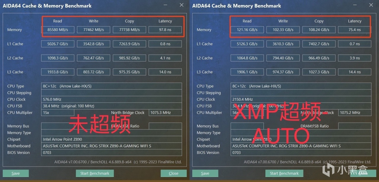 退出娱乐大师,使用专业的AIDA64工具测试一下,下图左是未超频,右图是开启AI智能超频和XMP-自动以后,可以看到读写速度都有非常巨大的提升,延迟也降低了。