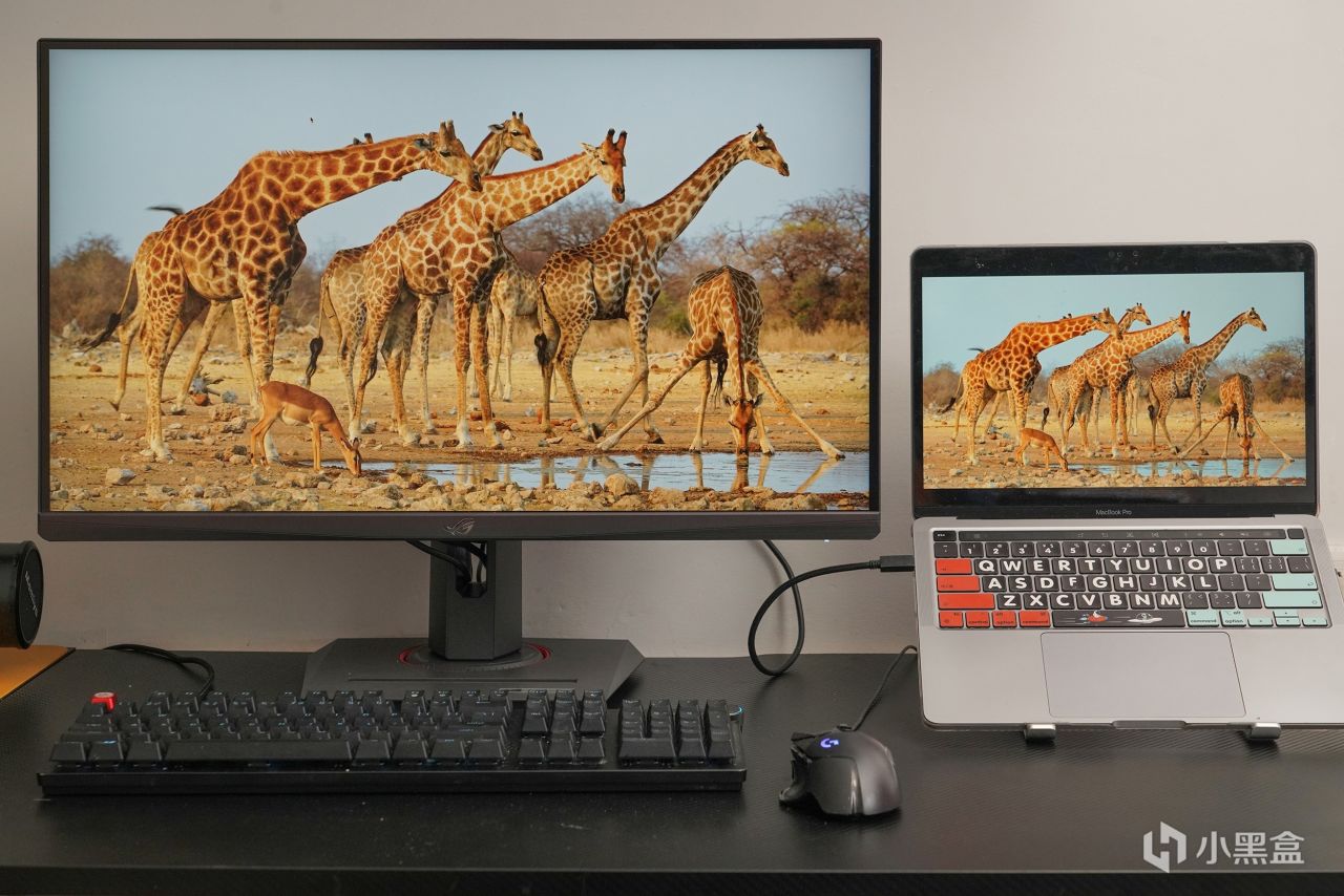 连上TYPE-C,这台电竞显示器还能随时当MacBook的扩展屏幕,进一步提高显示器的生产力价值。